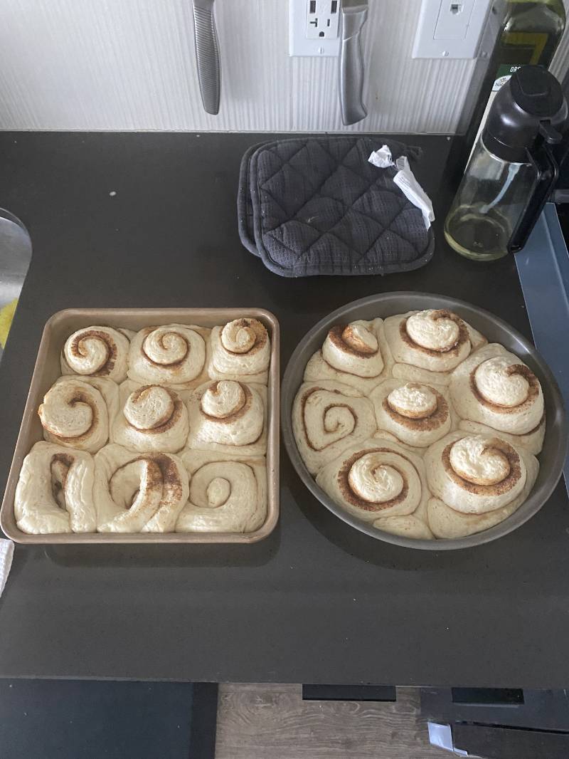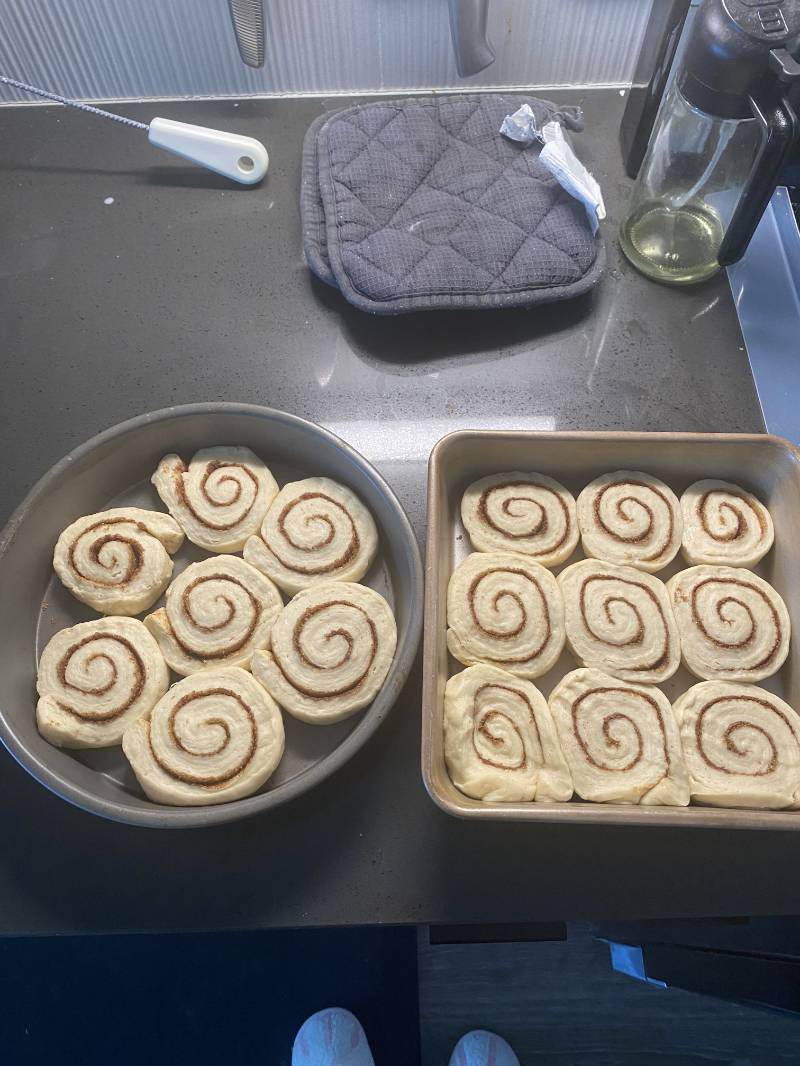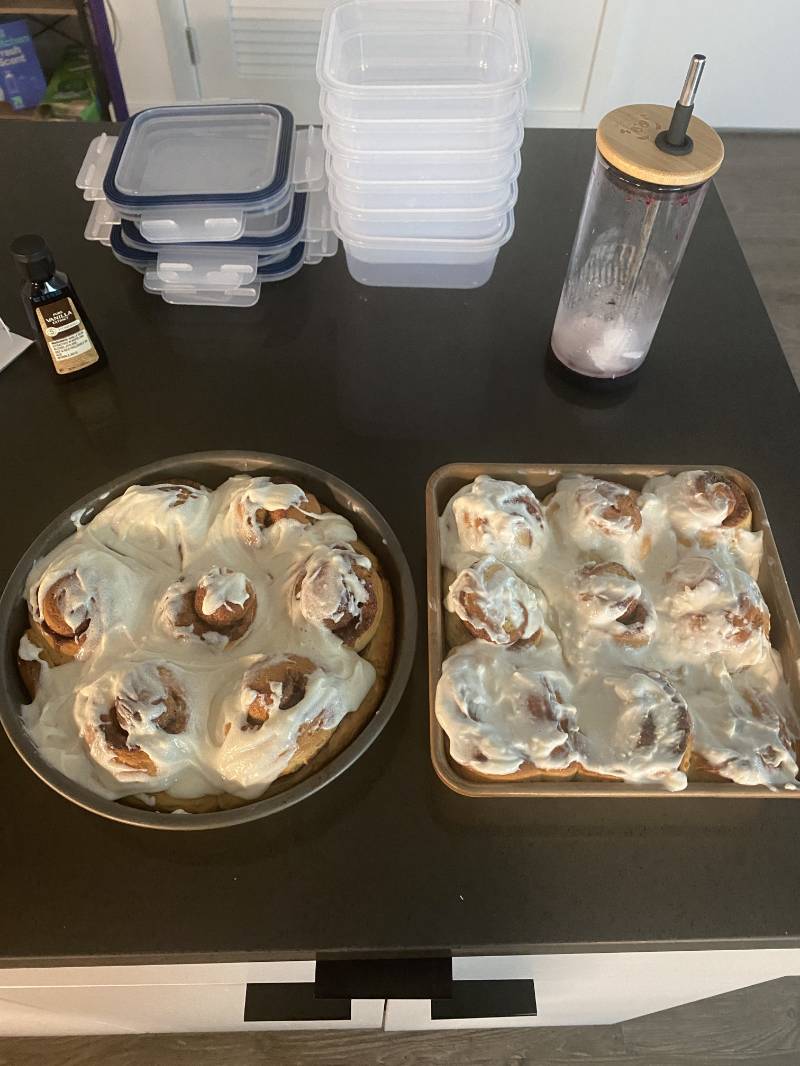 In the first picture, I made two different frostings. The one on the right was the standard version with cream cheese, milk, and sugar. The recipe called for butter, but I skipped it since there was already plenty of butter in the rolls themselves. The other frosting was my protein frosting, the same one I used for the Oreo brownies and Swiss rolls: made from yogurt, sugar, and cream cheese. It’s super good but has a slightly tangy flavor from the yogurt.